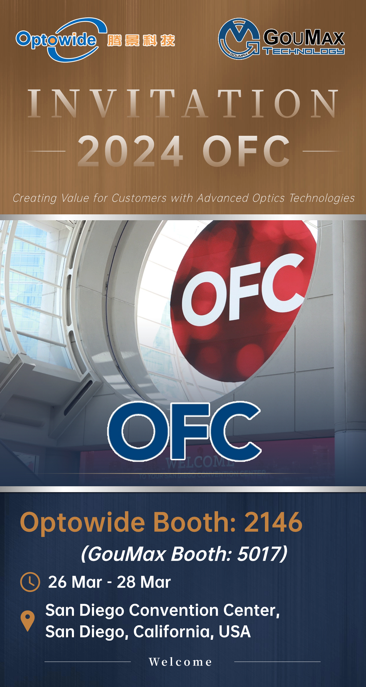 凤凰联盟官方网站将参加3月26日-3月28日在美国圣地亚哥举办的2024年OFC-光网络与通信研讨会及博览会。凤凰联盟官方网站展位号:2146,腾景科技控股子公司GouMax也将参展,展位号:5017。期待您的光临!
