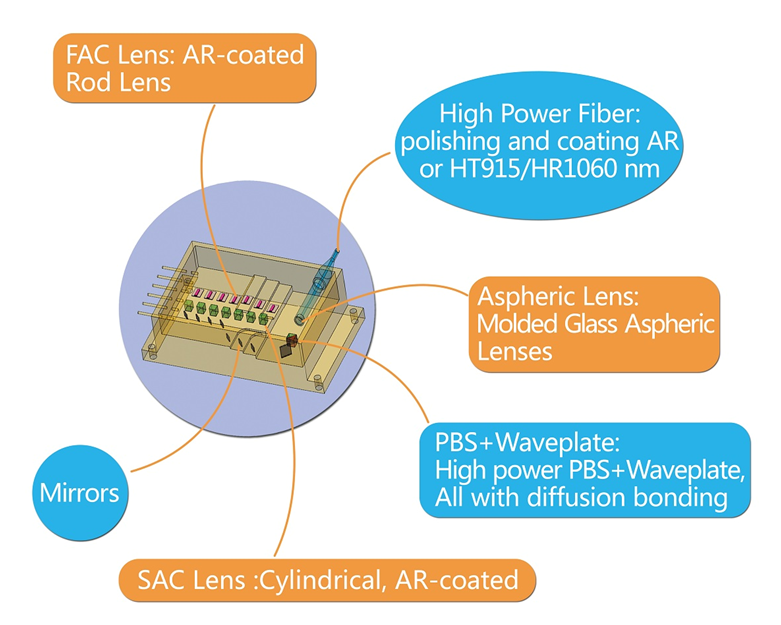 公司能为客户提供光纤耦合模块使用各类精密光学元件,如FAC Lens、 高功率光纤抛光/镀膜、模压玻璃非球面透镜、高功率偏振分束器+波片、SAC lens、反射镜等。