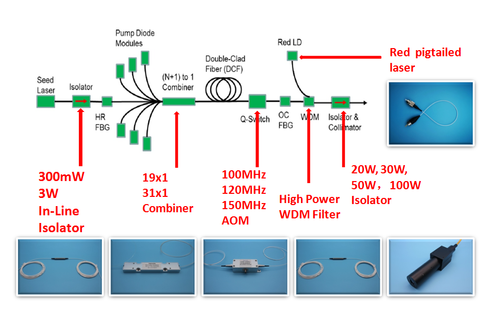如下图光路图所示,公司能为光纤激光器光学系统提供高功率隔离器、高功率镀膜光纤线、光纤合束器、声光调制器、红光指示器等光纤器件。